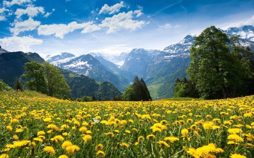 Decorate your desktop with this stunning  Spring Field Landscape With Yellow Flowers, Mountains, Blue Sky And White Clouds Beautiful Desktop  wallpaper. Choose one of the available sizes to fit every display size. Download this free  Spring Field Landscape With Yellow Flowers, Mountains, Blue Sky And White Clouds Beautiful Desktop  wallpaper in high resolution and use it to brighten your PC desktop, Ipad, Iphone, Android, Tablet  and every other display. To get the desktop background (wallpaper) click on the required resolution. You can also use a desktop background as your lock screen, or your Start screen background.